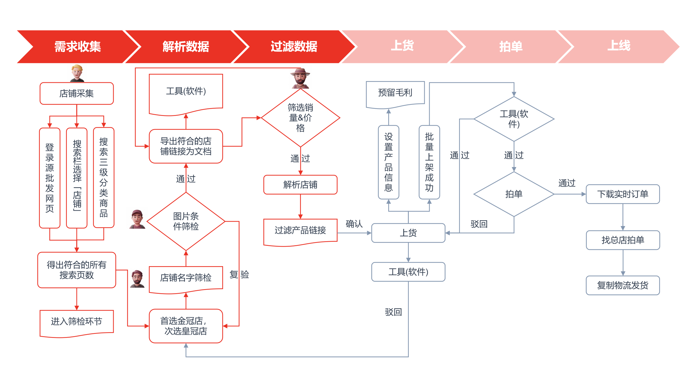 在无人化电商平台中,智能体(Agent)的应用是实现全自动化的关键。我们设计了多个专门的智能体来执行不同的任务,例如在【店铺筛选】环节中,涉及了以下智能体: